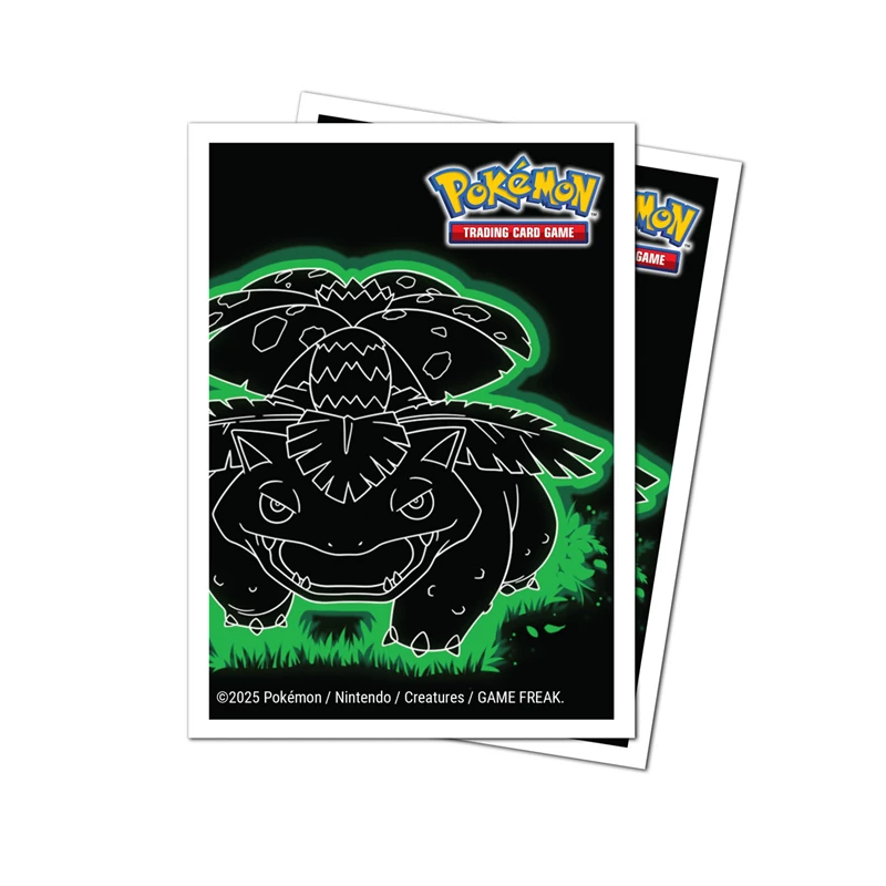 Impression vivante et texturée avec Venusaur néon sur fond noir uni.